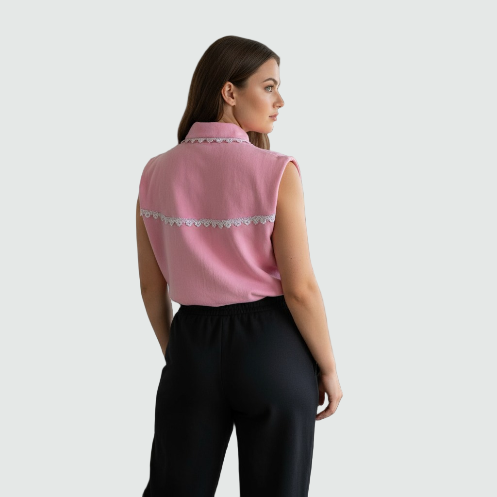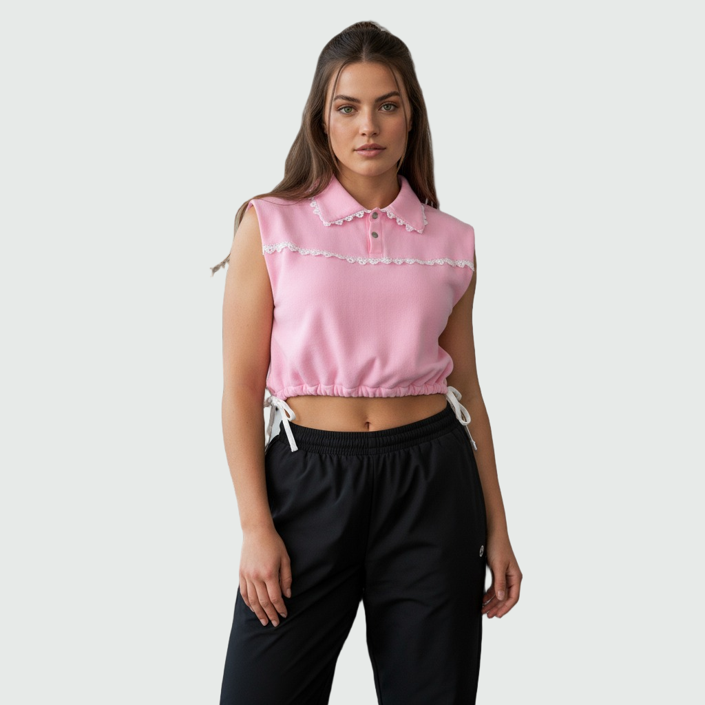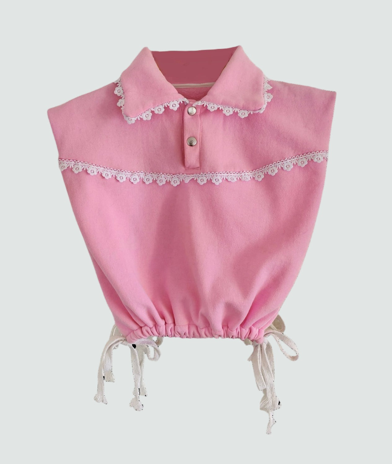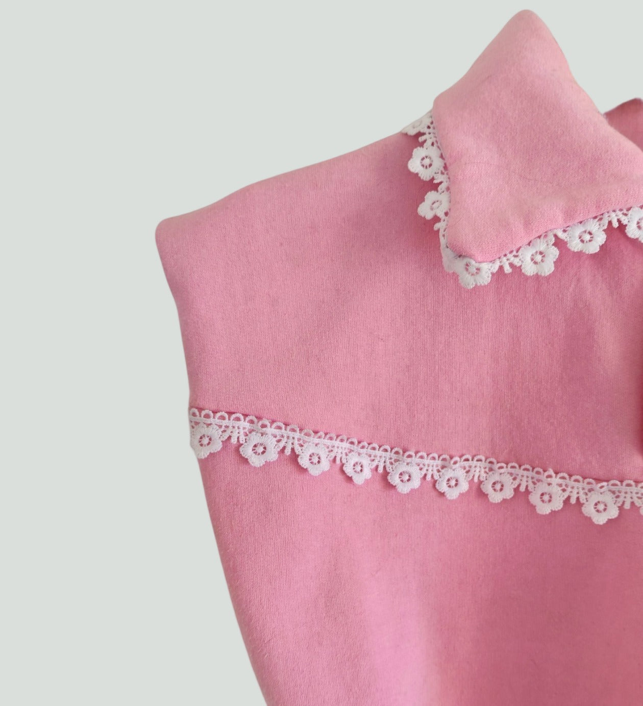 Poleron rosa con cuello BB, sin mangas en franela algodón. Con aplicación de flores en cuello, frente y espalda. Diseño con cordón ajustable en ambos costados.